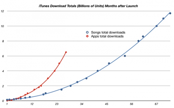 Last week I posted the iTunes download rate graph that showed how Apps are being downloaded much more rapidly than songs and revealed an inflection point in the song rate.