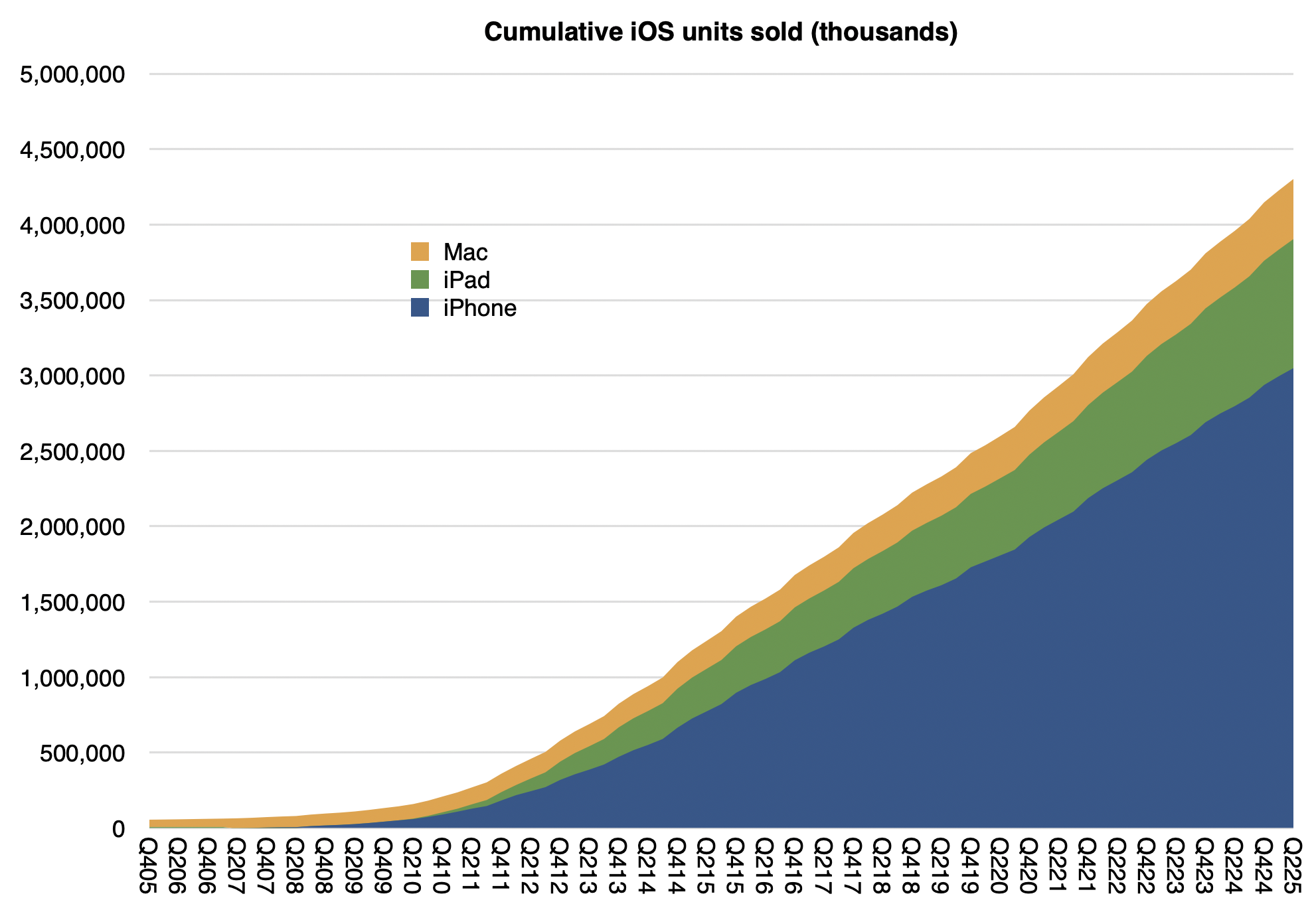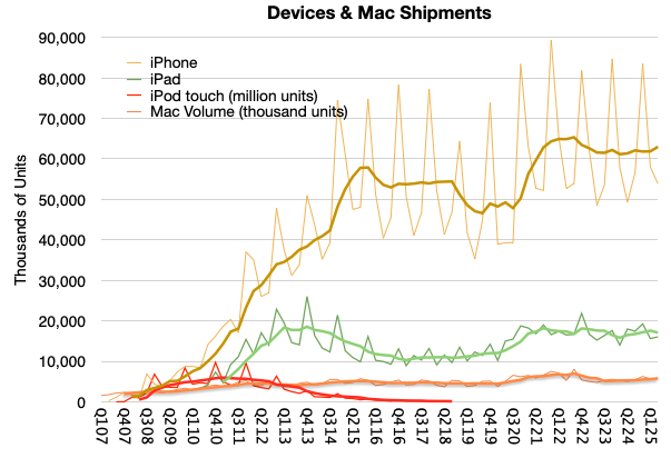 Not shown are iPods (touch alone is about 114 million), Watches (probably at least 250 million) and Vision Pro (single digit millions) or wearables and home. If we did include those, it’s a safe bet that Apple has shipped over 5 billion devices.