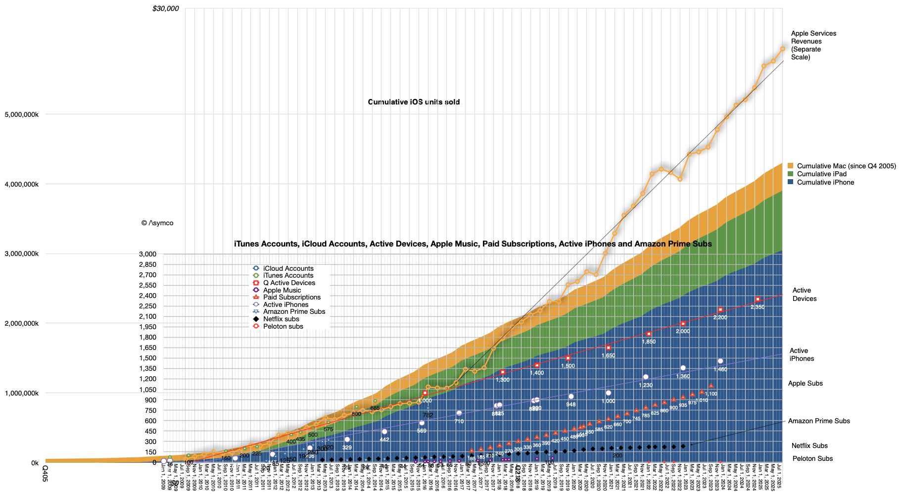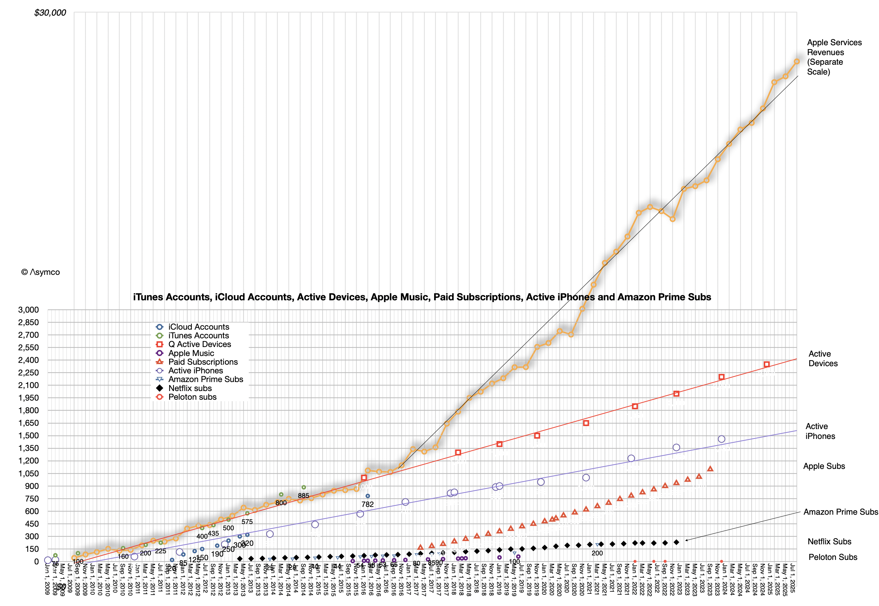 The linear extrapolations for active devices, active iPhone and, on a separate scale, actual Apple Services revenues can be seen. Also subscriptions, as long as they were available, plus other data sets for comparison such as Amazon Prime subscriptions, Netfilx and old Apple Music and iCloud account data.